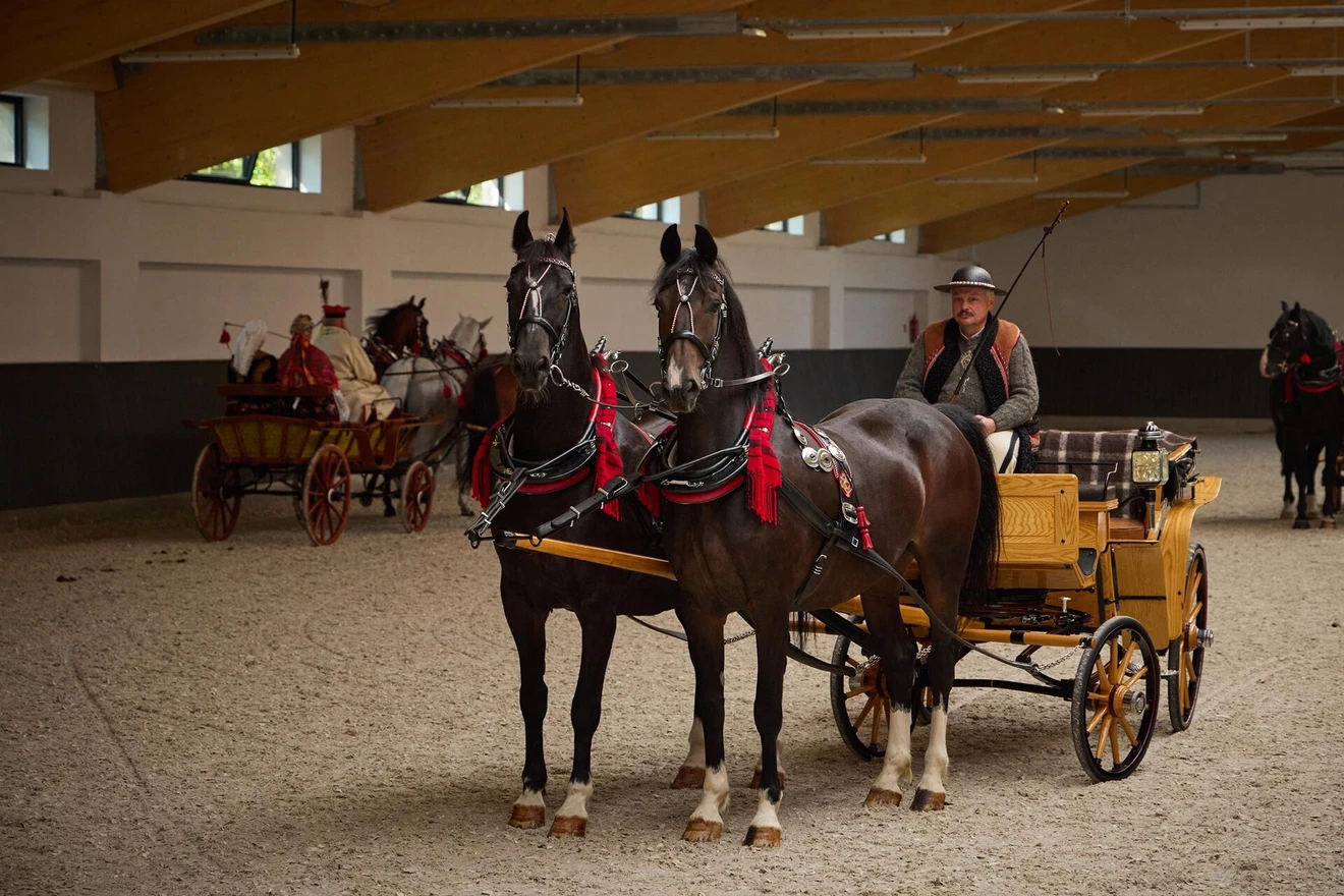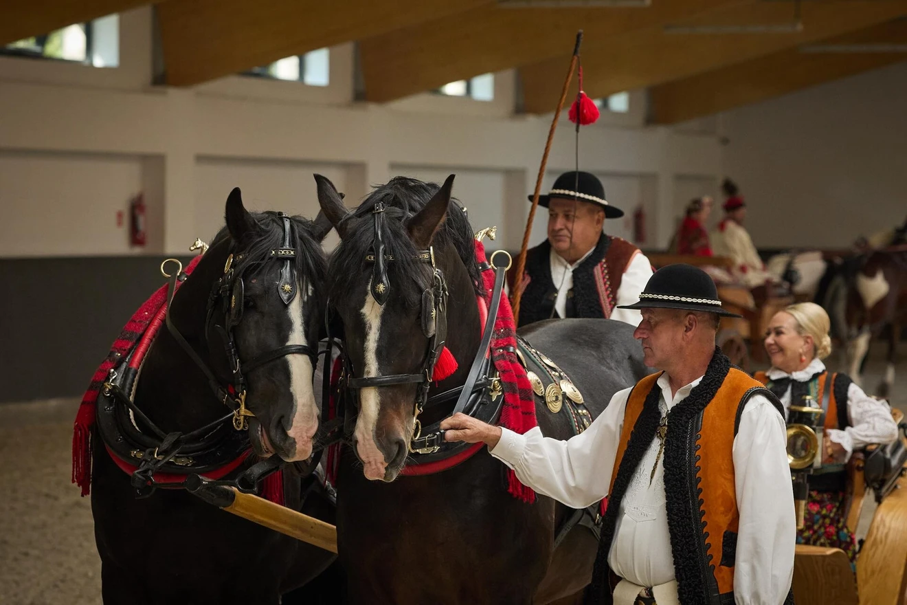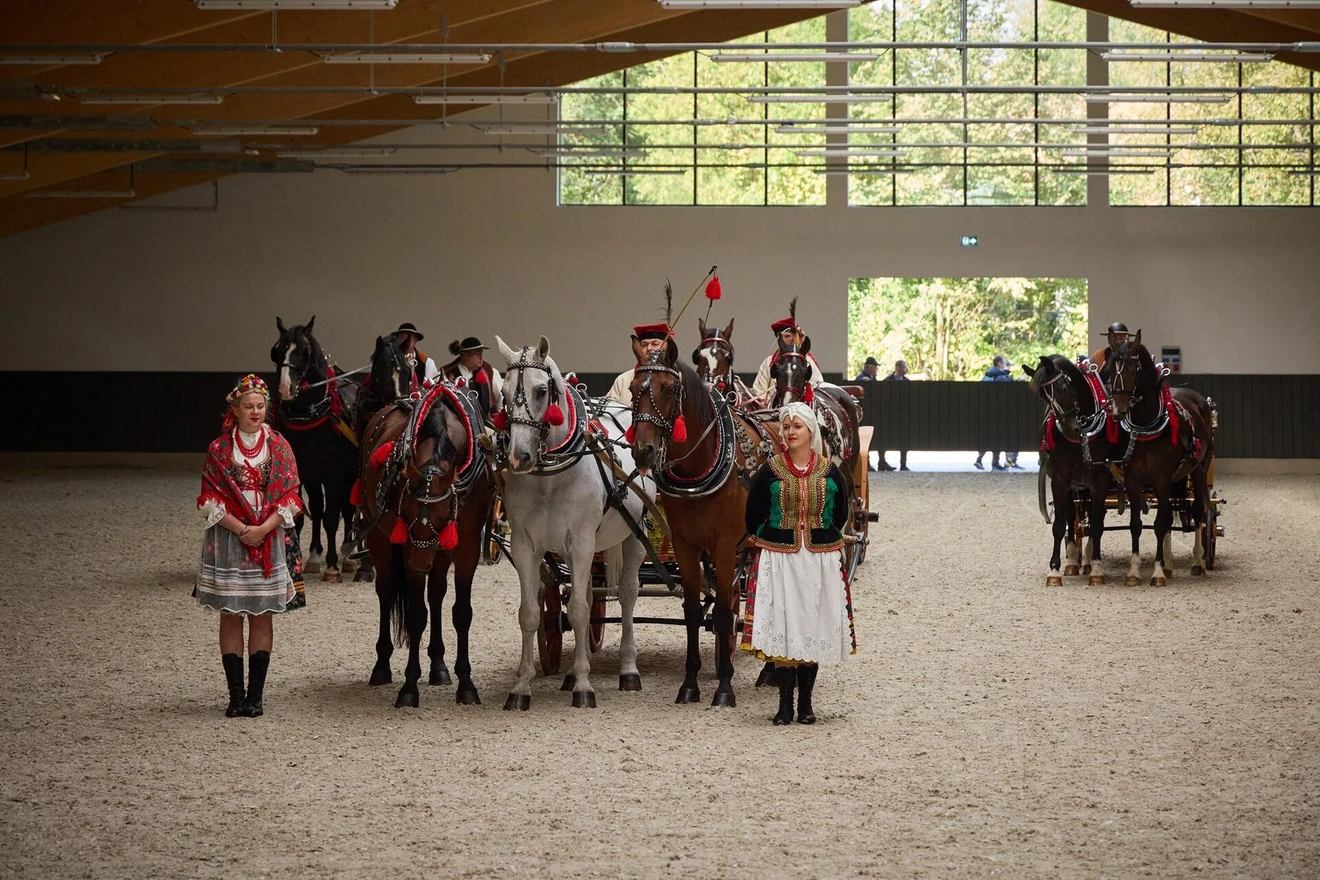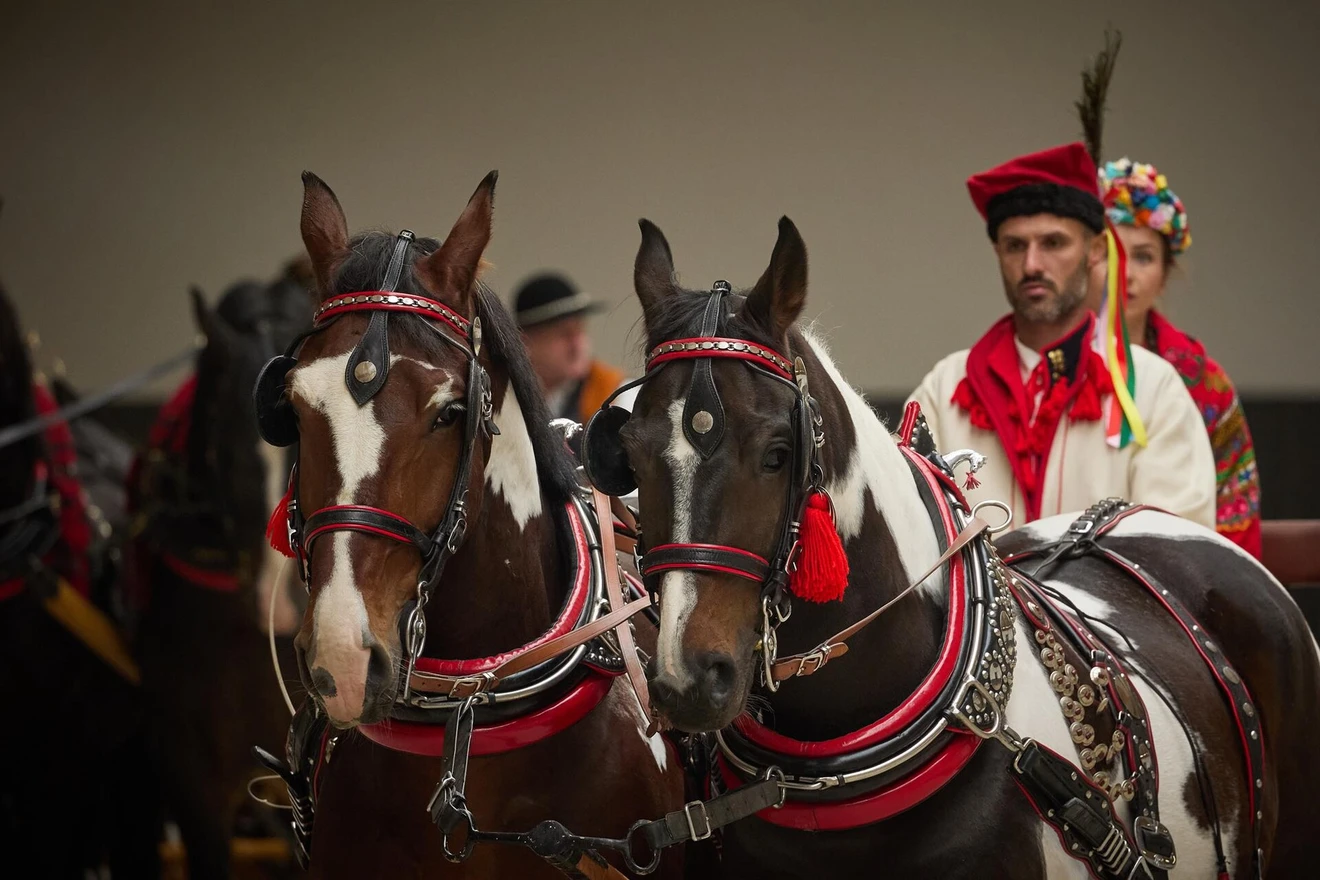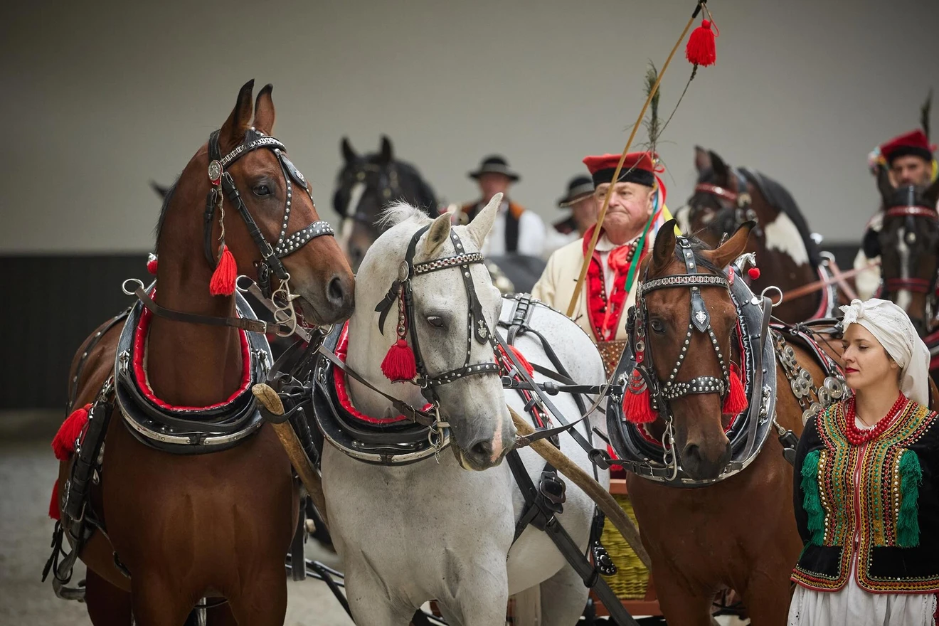 Po tym pięknym pokazie do hali wjechały zaprzęgi regionalne w stylu krakowskim i góralskim. Zaprzęg trzykonny w poręcz w stylu krakowskim prezentował jego właściciel, pan Czesław Trzos, uczestnik wielu zawodów tradycyjnego powożenia, organizator Międzynarodowych Zawodów Tradycyjnego Powożenia w Niepołomicach. Pasażerkami były Dominika Maj i Paulina Gądek, panie zaprezentowały się w strojach „mężatki – gospodyni” i „panny” obie panie interesują się i czynnie uczestniczą